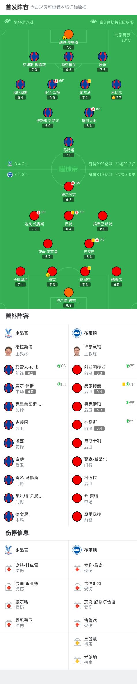 水晶宮0-0布萊頓,薩爾、皮諾射門造險,呂特假摔染黃